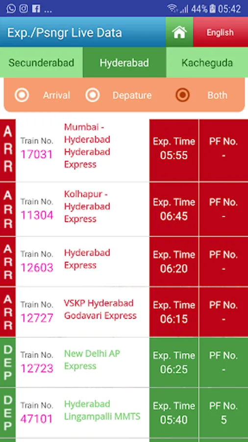 This section displays the live status of all the trains currently expected to arrive/depart at/from Secunderabad, Hyderabad and Kacheguda stations. You can view the info in any of the 3 languages – English, Hindi or Telugu.