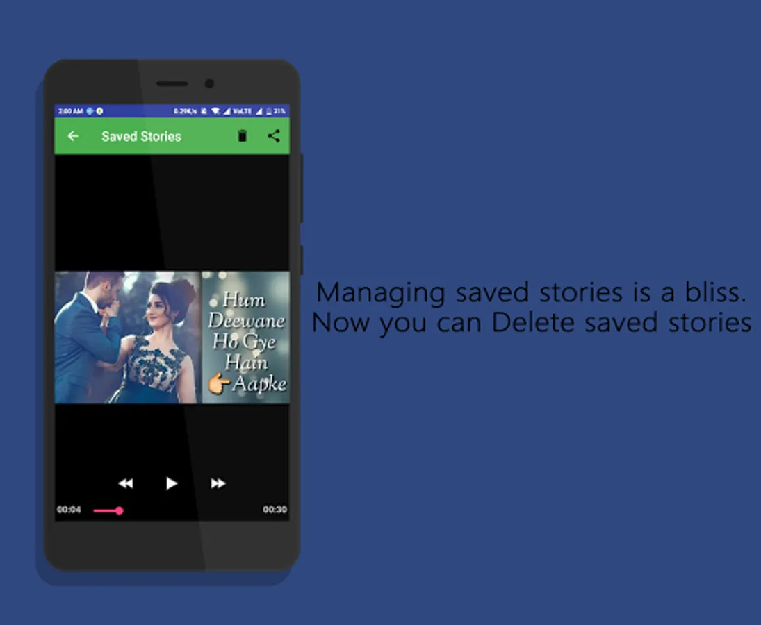 - Elegant dashboard to manage i.e., Delete and Share Saved Stories/Status.