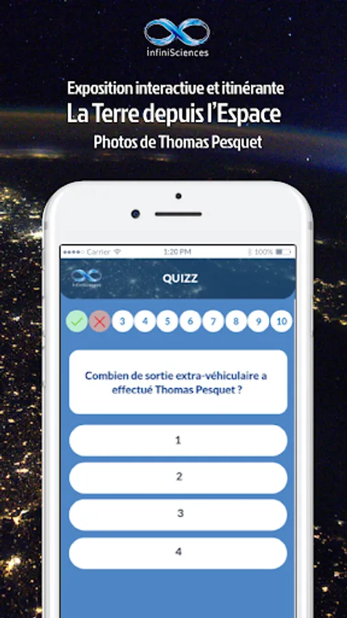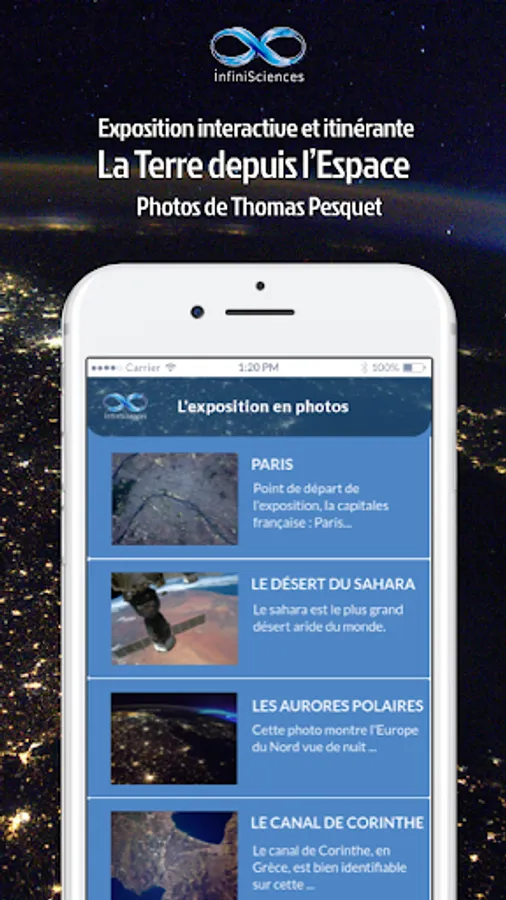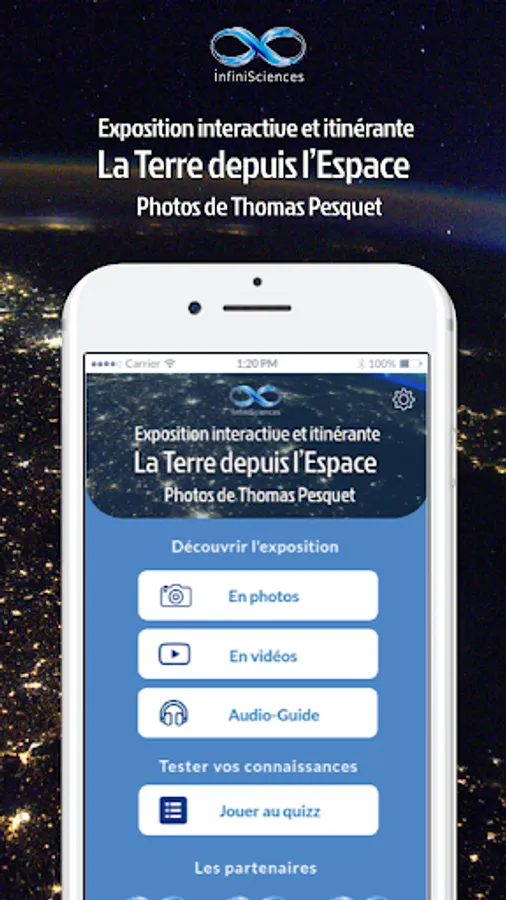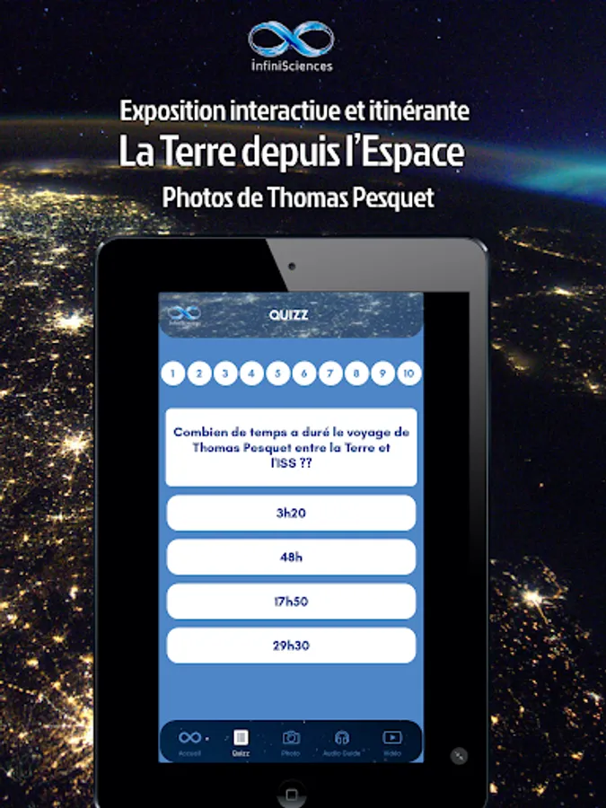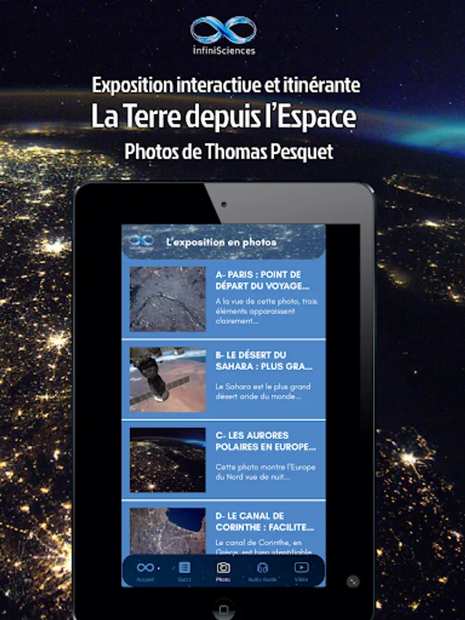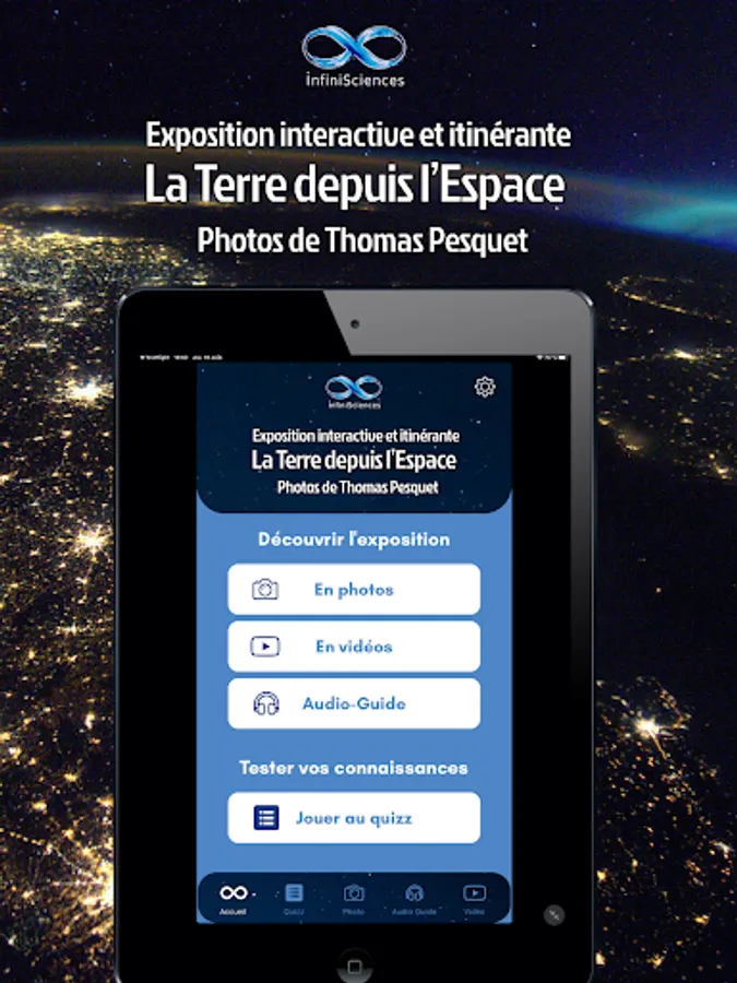 The application offers interactivity during the visit of the exhibition "The Earth from Space: Photos of Thomas Pesquet" by grouping together all the photos and videos of the exhibition, the audio guide and a quiz