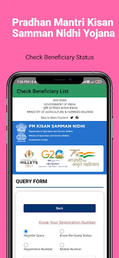 First Install This pm kisan samman nidhi yojana App. After Successfully Installed. Open The App Click Beneficiary Status Buttons for view status and click New Farmer Registration button for New Registration and click Beneficiary List button for check list and click Status of Self Registered Farmer button for check status and click e-KYC button for e-KYC