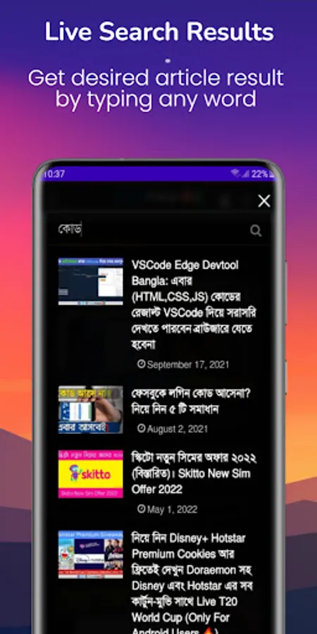 • Live Search Results: Get desired article result instantly by typing any word of the article.