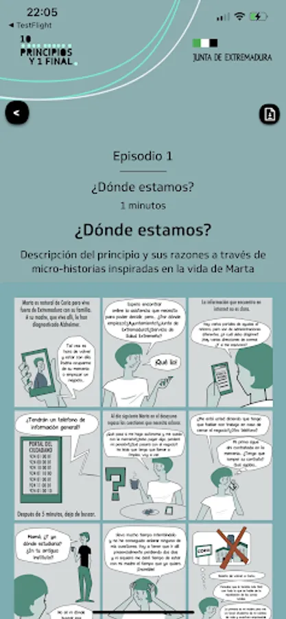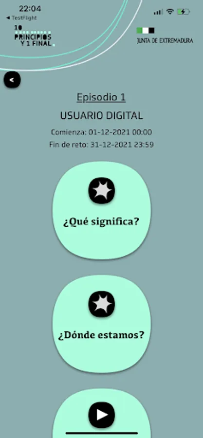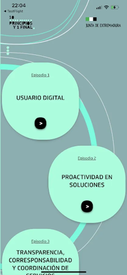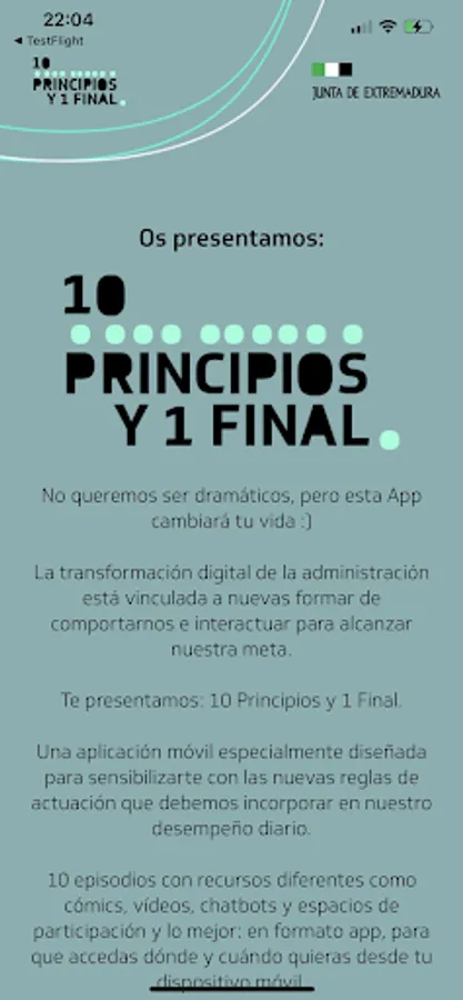 10 Principles and 1 Final is a mobile application to discover how the use of the 10 principles of the Digital Modernization Plan of the Junta de Extremadura impacts citizens and the way this administration offers services.