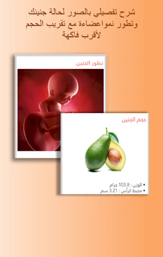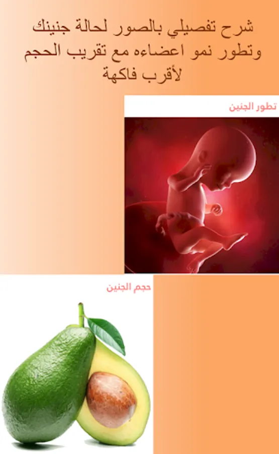 Your pregnancy matters to us - Pregnancy Calculator: You are pregnant week by week..and in each week of your pregnancy there is a full explanation of the development of your fetus with a picture showing its current shape inside the womb..it also brings you its size to the size of the most famous fruit. Every week he also informs you about the changes that occur in your body and the symptoms that you can feel so that you do not worry about any new change.