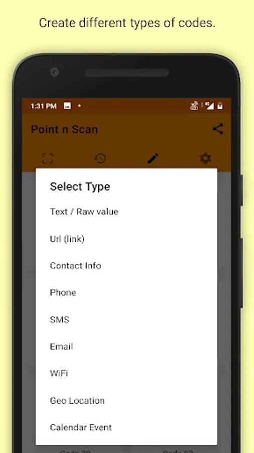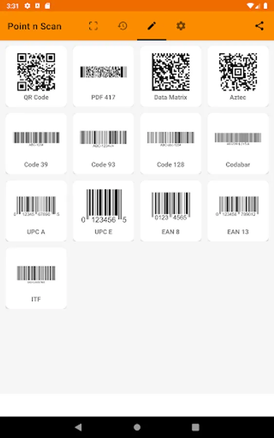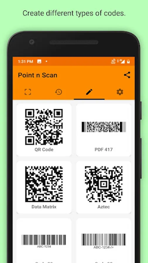 Scan a variety of codes either using camera or scan an existing image file. Generate QR, Aztec, Barcodes etc. easily with the app. History that helps you recreating codes that were scanned earlier.