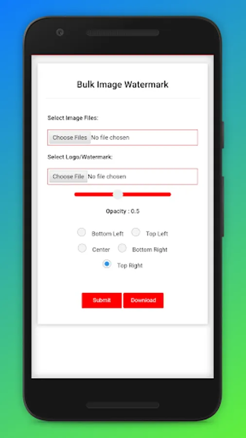 Image Watermark app helps users to apply watermark on their images in a click . This app allows user to set position and size of watermark in the image.