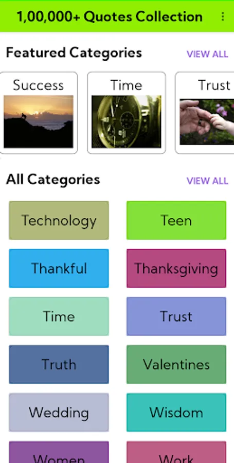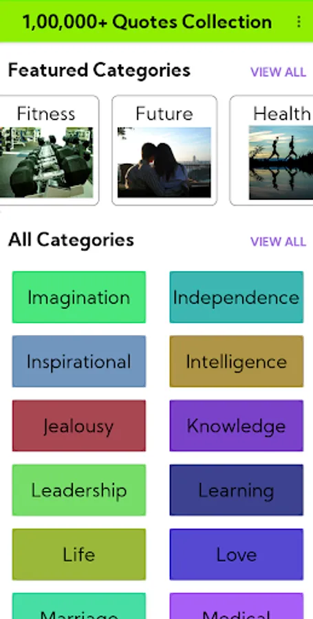 Well , You are in the right place . This app contains almostly close to 100000 Quotes with almostly 99 Categories .