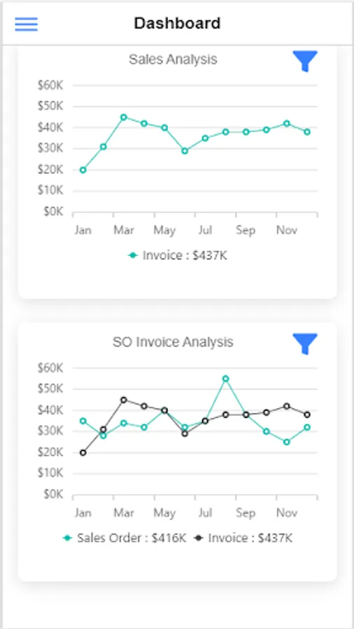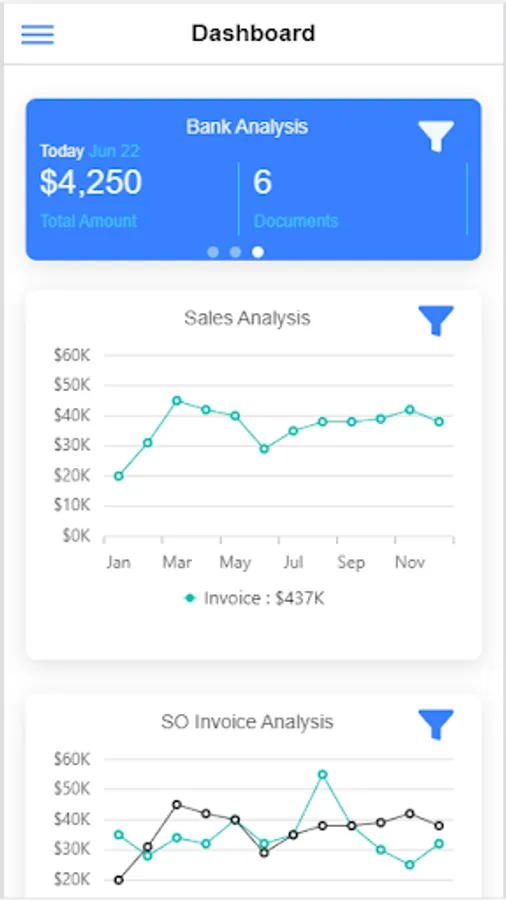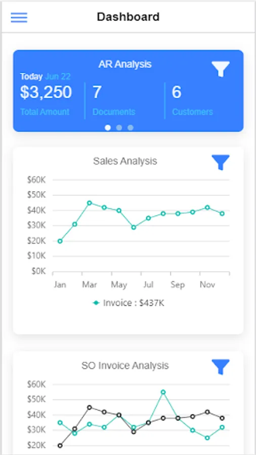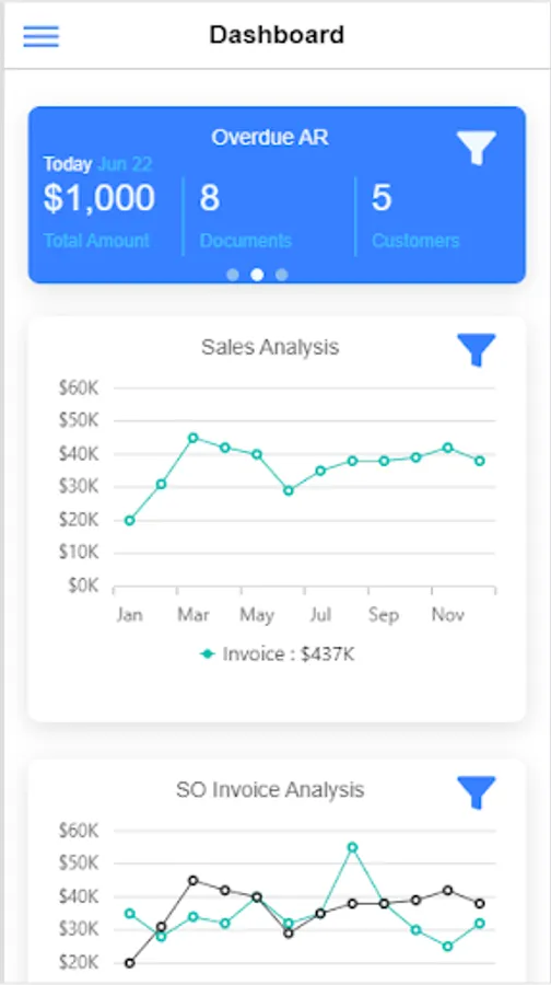 features include AR Analysis,Overdue AR, Bank Analysis, sales Analysis and SO Invoice Analysis