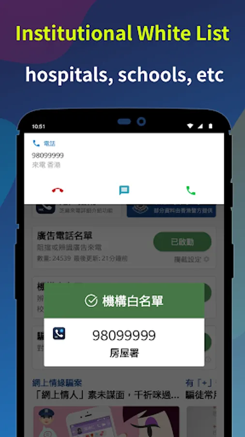 【 Institutional White-List 】Identify calls from institutes, e.g. hospital, schools... etc