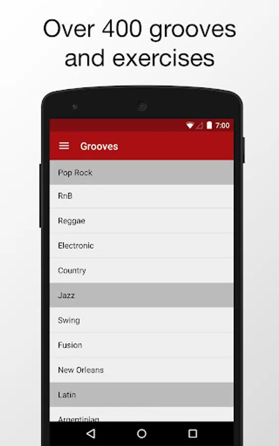 Included styles: Rock, Rock'n Roll, Alternative Rock, Heavy Metal, Punk, Blues, RnB, Hip Hop, Funk, Reggae, Ska, Disco, Drum'n Bass, House, Techno, Country, Bluegrass, Jazz, Swing, Dixieland, Ragtime, Fusion, New Orleans, Tango, Bossa Nova, Samba, Afro Cuban, Soukous, Calypso, Waltz and many more.