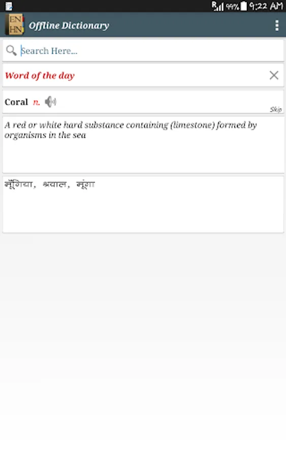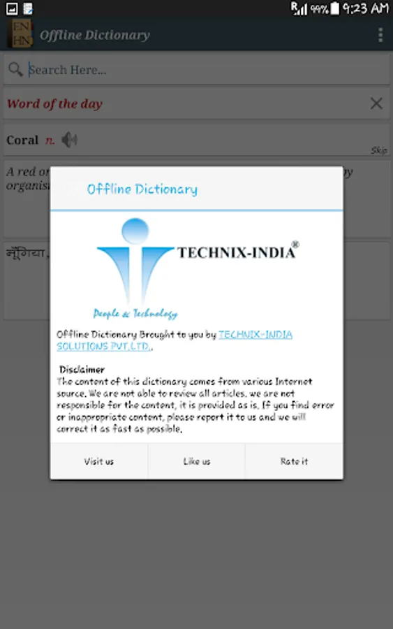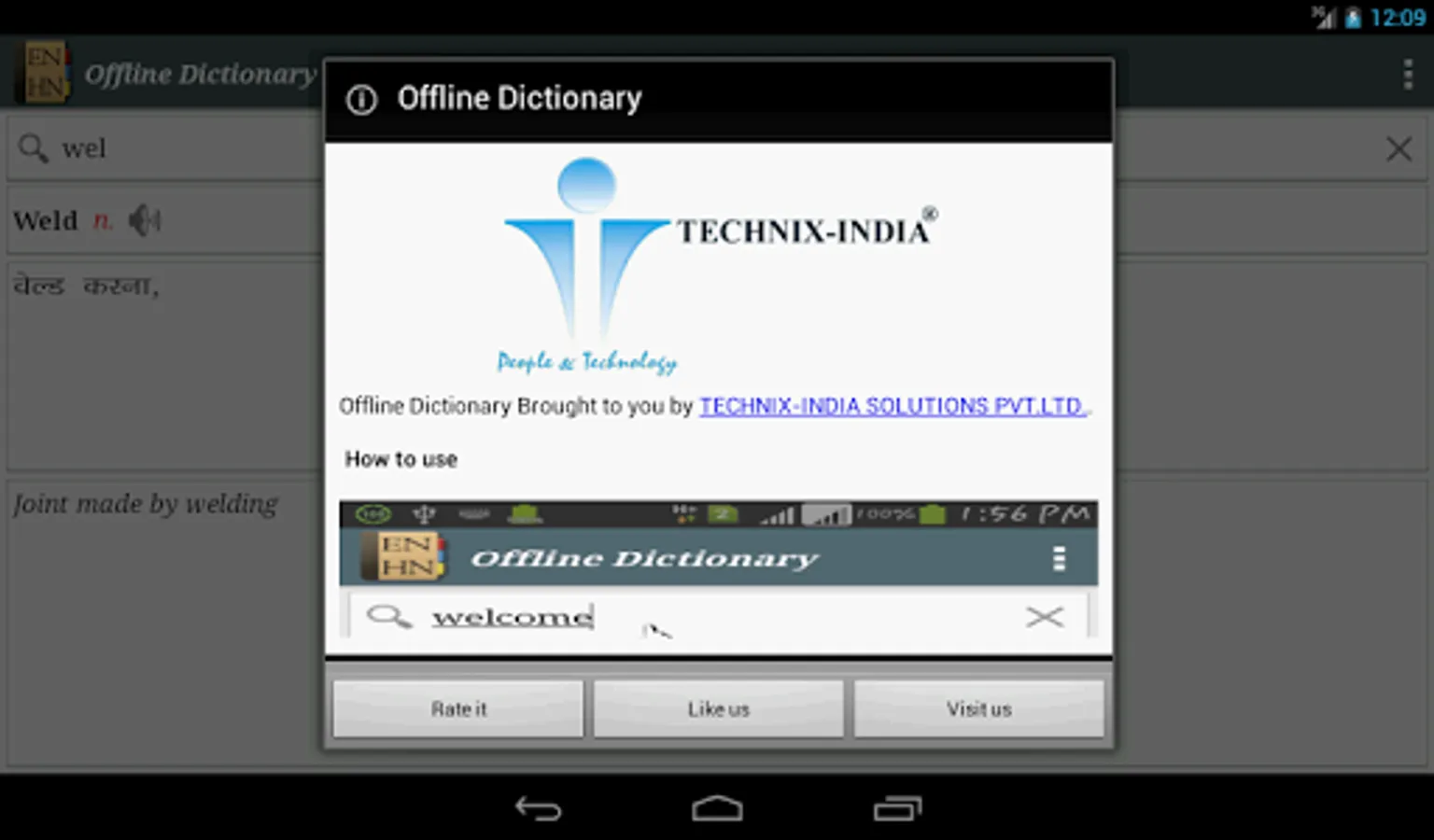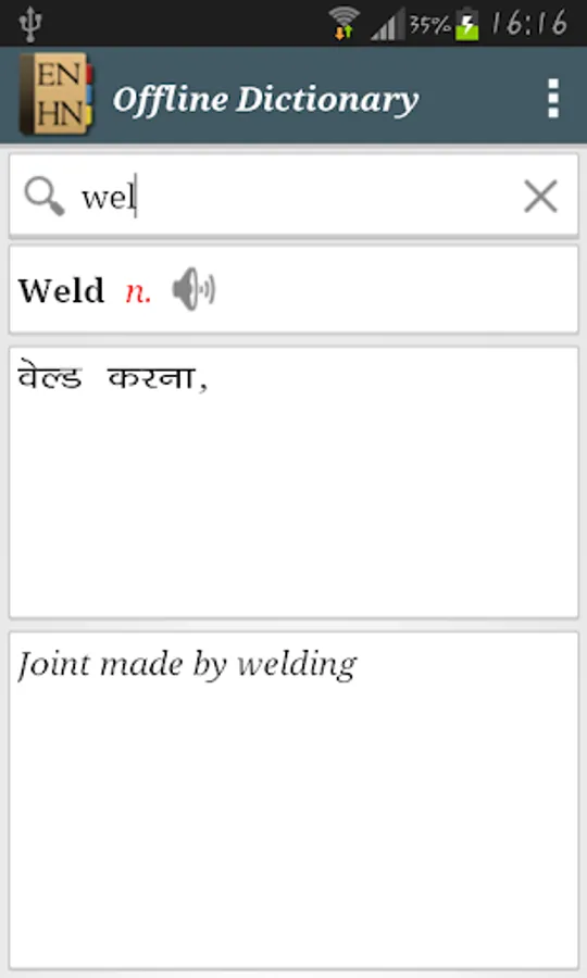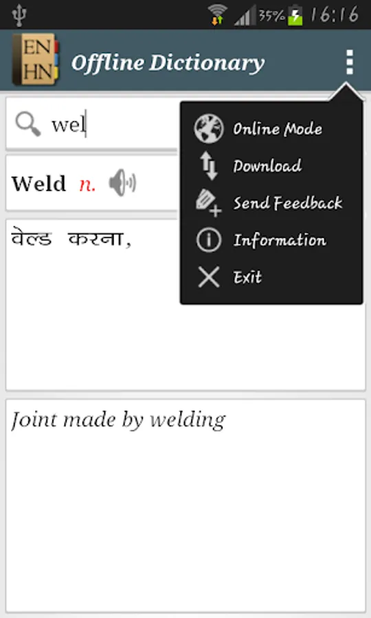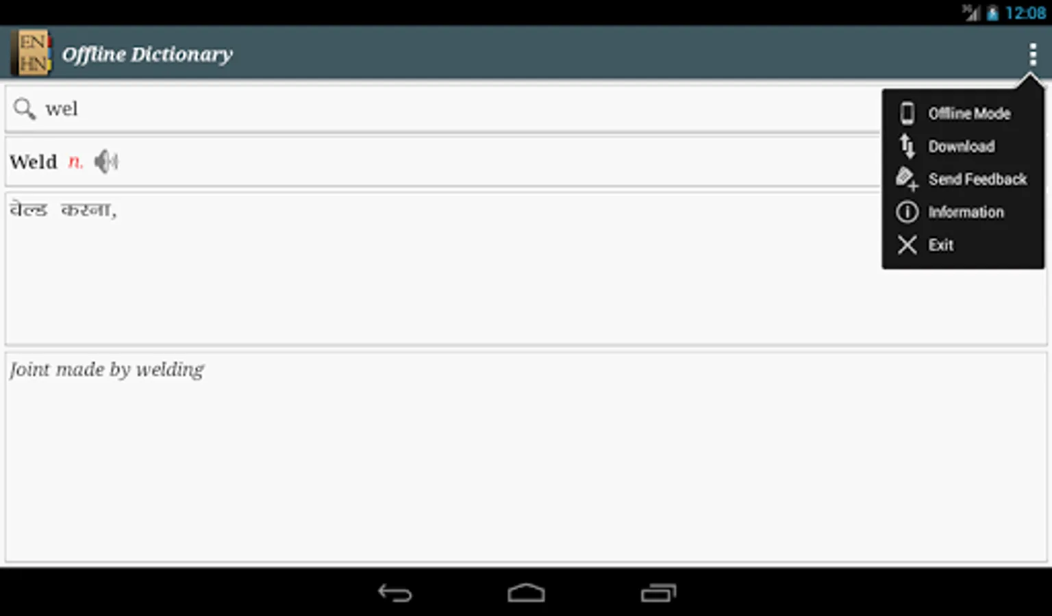 Offline Dictionary is free Dual Mode(Offline or Online) dictionary application explains the meaning of English word both English and Hindi!. Offline Dictionary is Hindi to English and English to Hindi 100 % offline and free. Definitions are based on English Wiktionary.