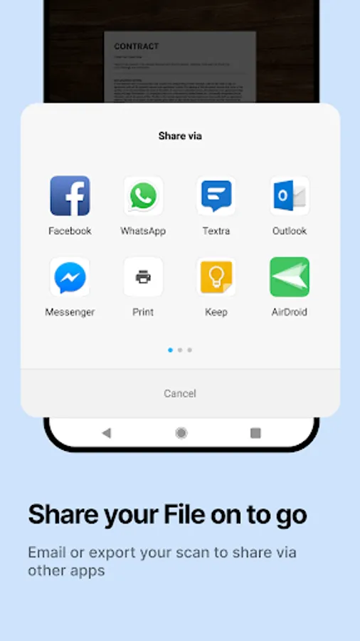 • Share your scanned documents as PDF or JPEG format with your contacts using Quickscan App.