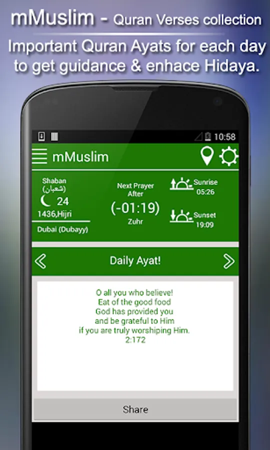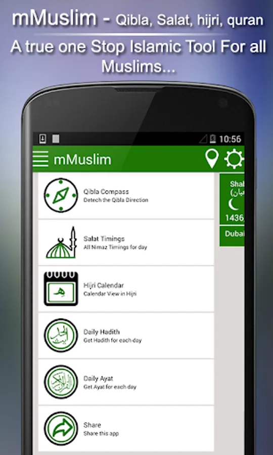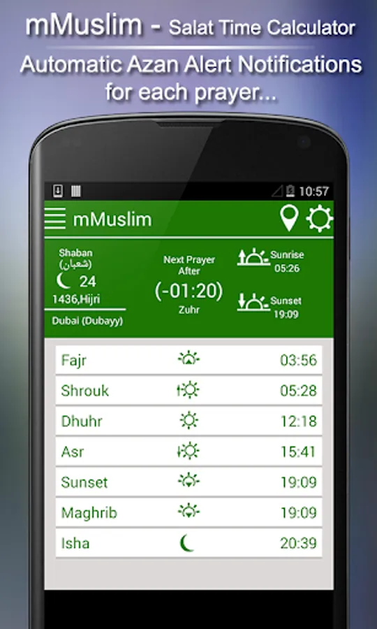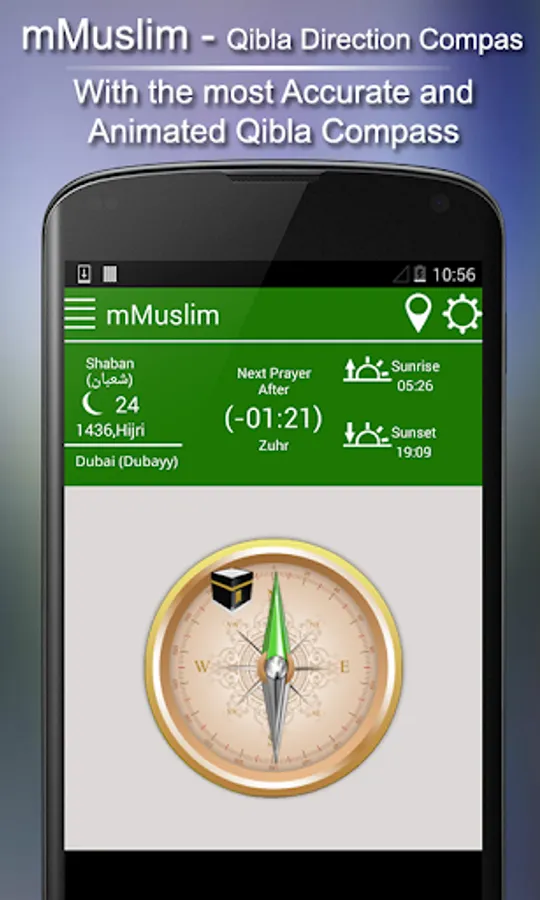 It is the most accurate Prayer time & Azan notifier for mobile devices . mMuslim also features Accurate Qibla Direction Finder, Islamic Hijri Calendar , Daily Sahih Hadith , Daily Quran Ayat, Sunrise and sunset Calculator.