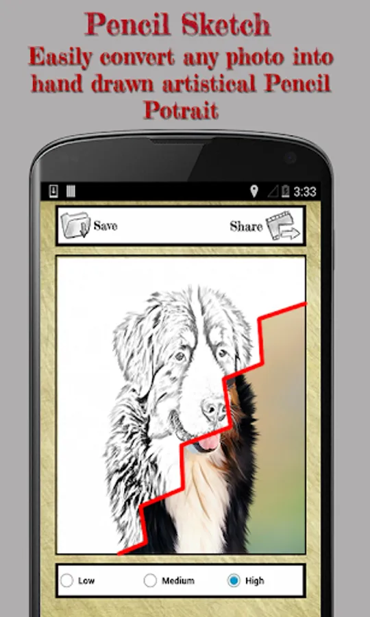 Pencil Camera is a smart phone app which converts your picture to pencil sketches. Just select your image from gallery or take a new picture with camera and the app will automatically convert the photo into pencil drawn sketches within seconds. You can increase the pencil tip intensity by selecting either low, medium, high.