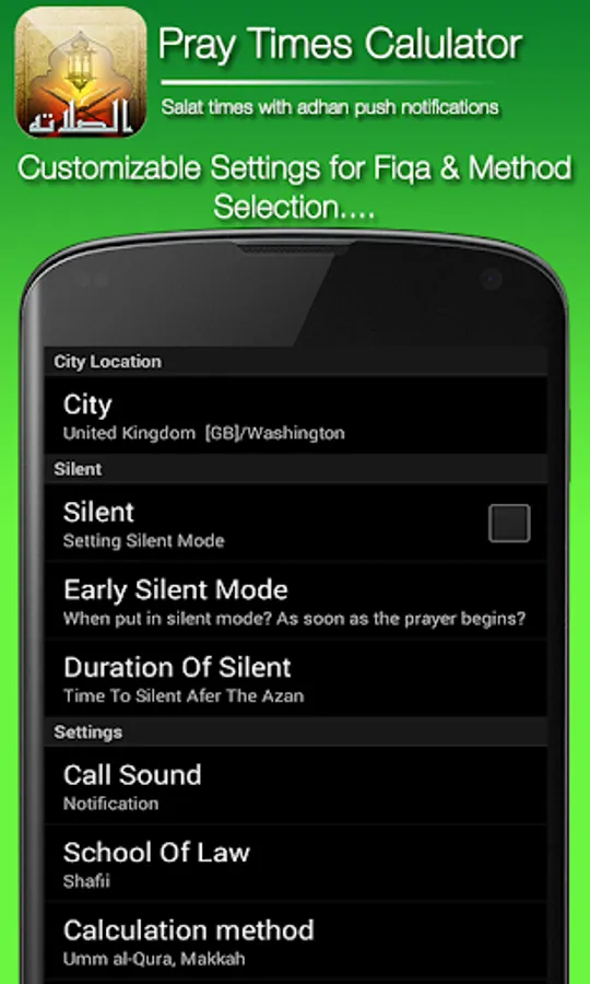 -- Additionally you can also change mazhab and calculation method for pray time calculation