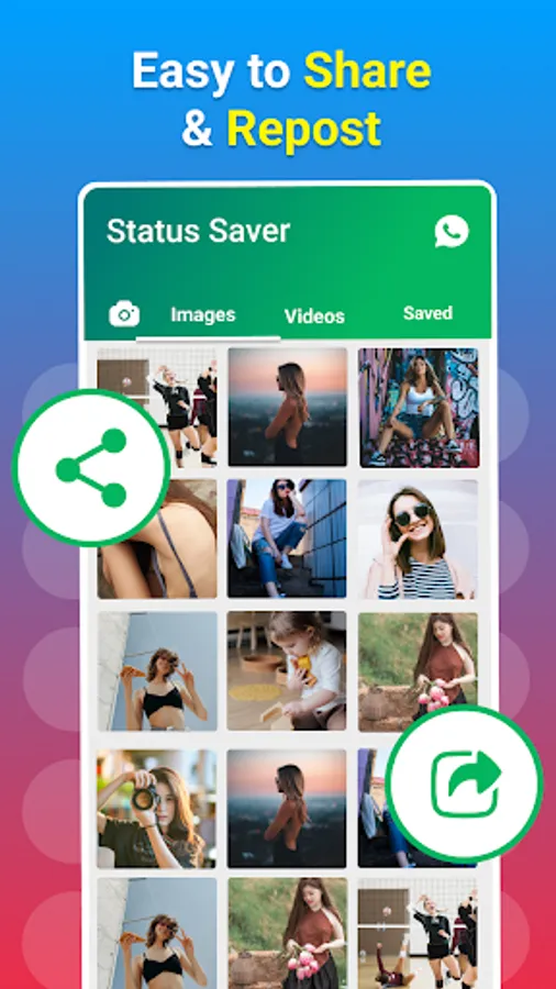 Status saver 2022 is full of fun and joy. Enjoy our amazing content of save photo status and video status at any time. Save whatsapp status and share them with friends, or repost the downloaded status on other social media. You can switch to whatsapp business status saver app in Status download app and can save status images and videos statuses with few clicks.
