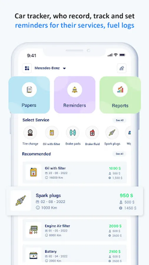 - Vehicle maintenance tracker app also helps you save money by keeping track of your - mileage, car services, service reminders, petrol efficiency and car expenses