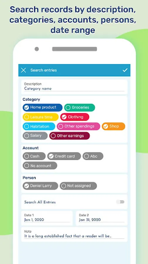 • Search your any entry by description, categories, accounts, persons, date range and notes.