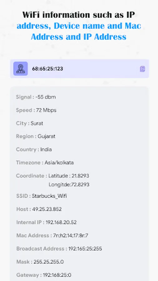 - WiFi information such as IP address, Device name and Mac Address and IP Address.