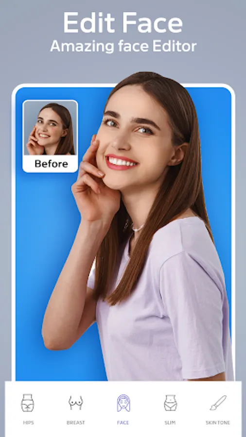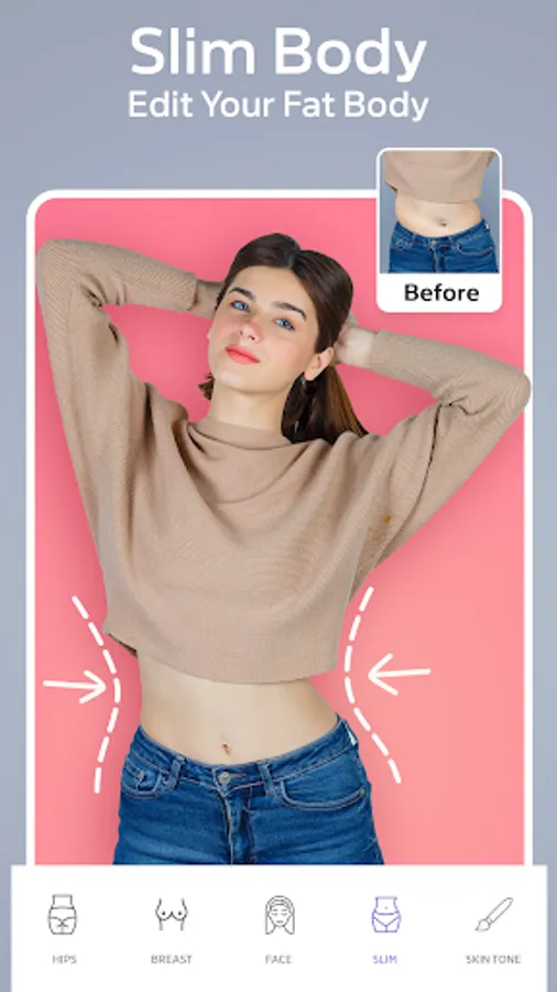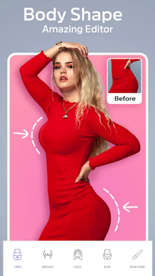 Face & Body Shape Editor is the perfect skin with additional features like body slim, waist slimmer and many more!