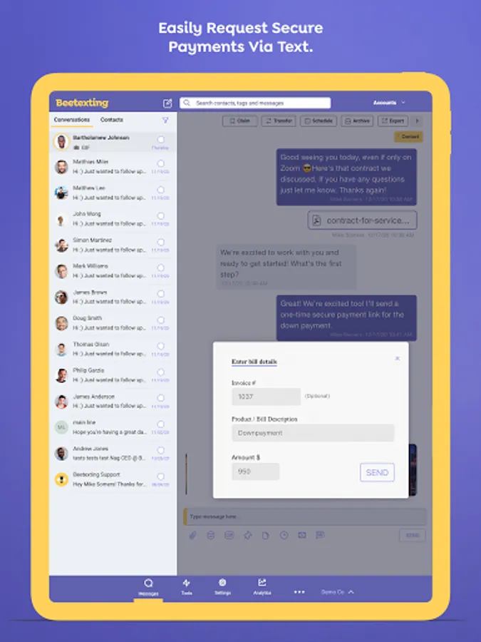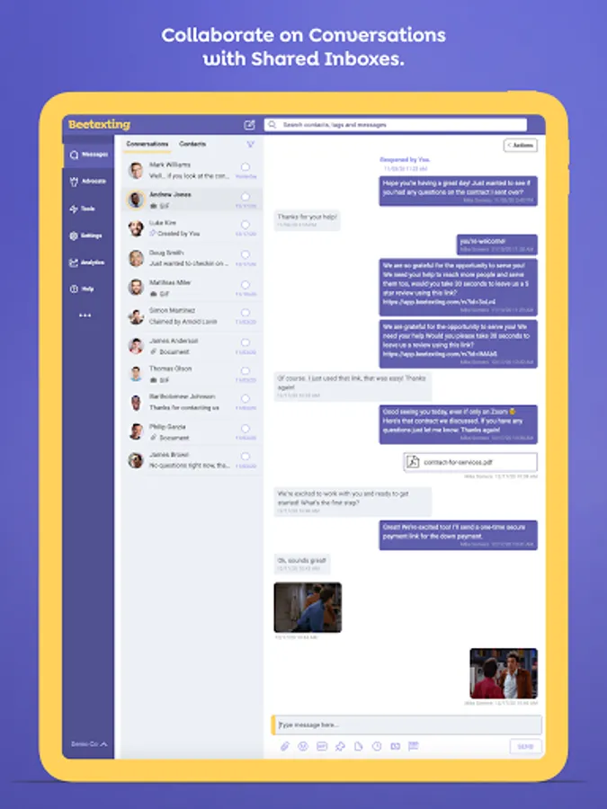 Beetexting is a business text messaging app that sales and service teams use to build deeper stronger relationships with their customers and clients. Team's love it because it's more than just text message marketing software for mass texting; it's an entire texting platform or SMS/MMS CRM for teams to have conversational discussions with each other and their customers thru text message. Your team can access the services from their desktop computer or on-the-go with this app.