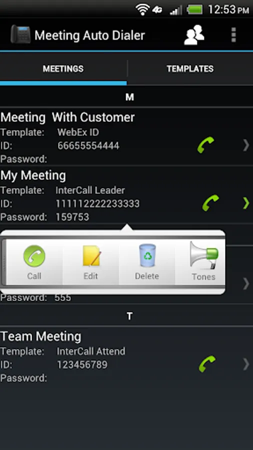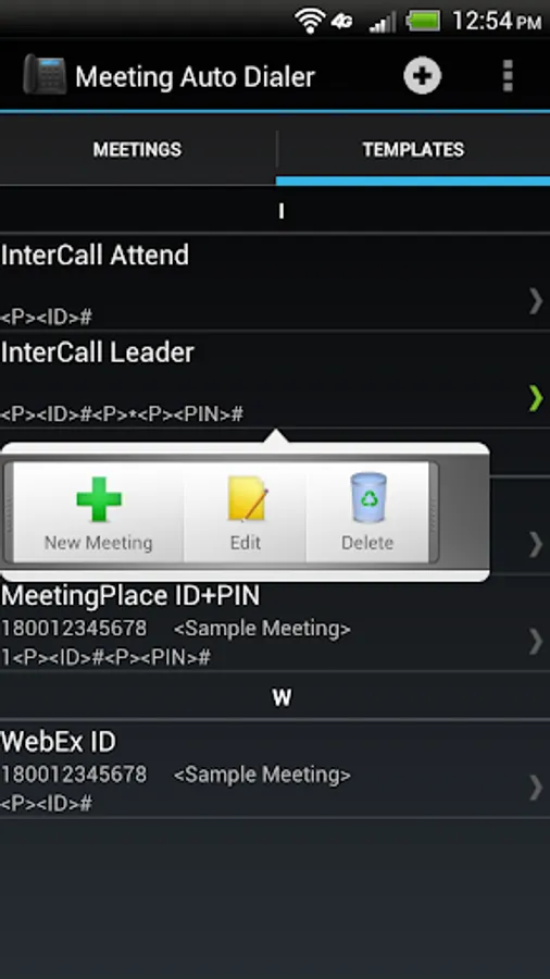 • A template consists of a phone number and a sequence of IDs, passwords, numbers, pauses, hashes and stars in a particular sequence as defined by the meeting format.