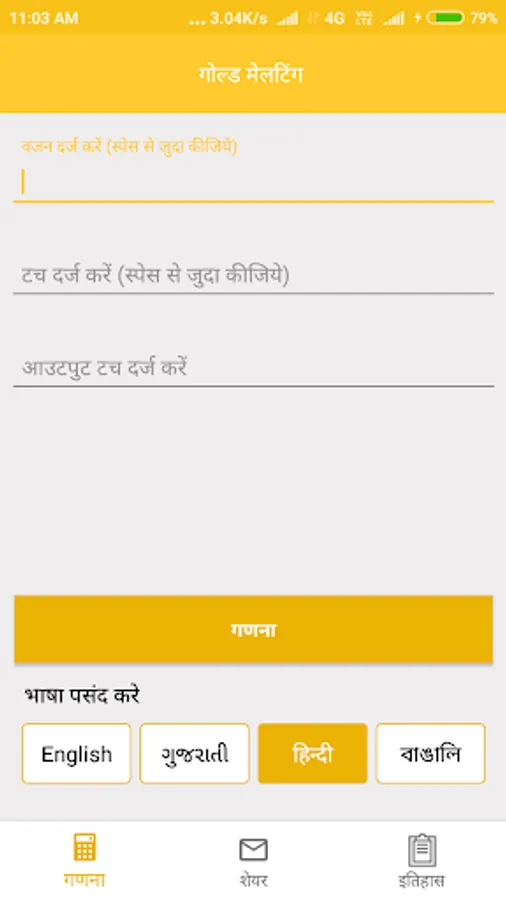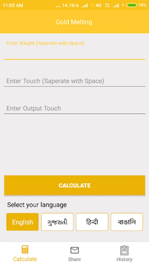 Gold Melting is powerful app for all the Gold Smiths to calculate melting of gold. Gold Melting app precisely calculate how much pure / alloy should be added to gain the desired output. It also supports multiple melting in one go. It means, you need to separate all the number by space and it will calculate for all the numbers given