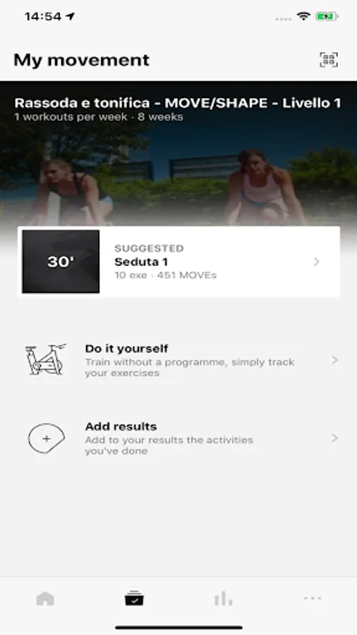 MEINE BEWEGUNG: Hier finden Sie Ihr Programm daswir für Sie erarbeitet haben, gebuchte Kurse, Herausforderungen, denen Sie beigetreten sind, und alle anderen Aktivitäten, die Sie im Studio oder Outdoor absolviert haben.