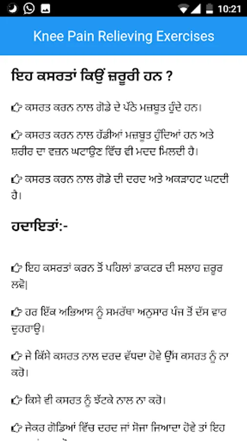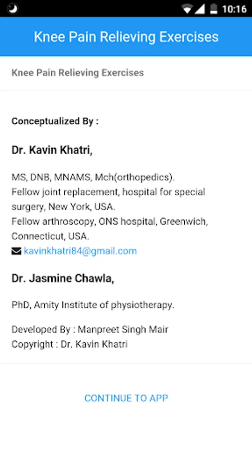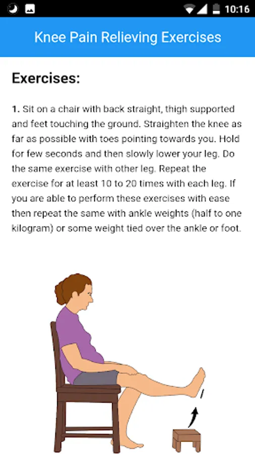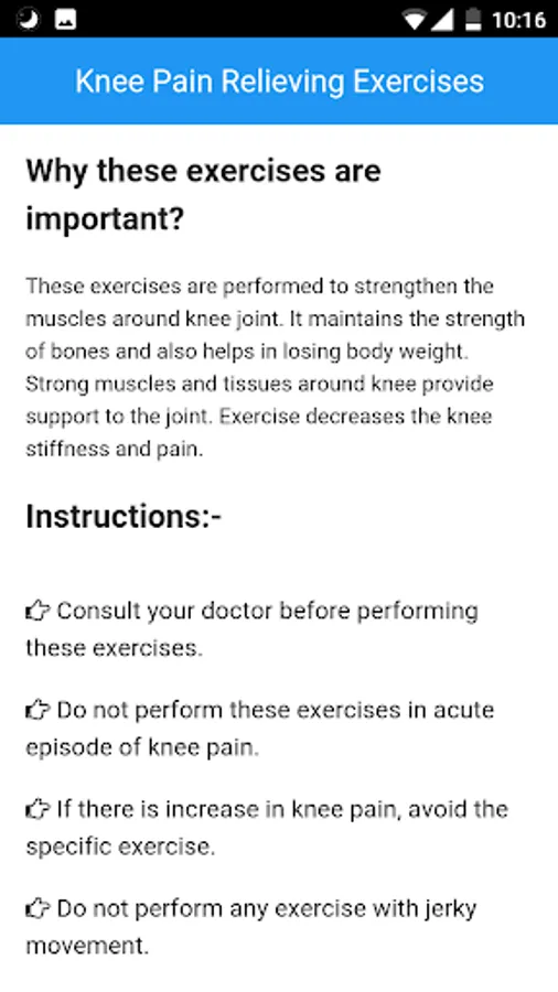 The mobile application has been specifically designed for people suffering from knee pain or arthritis of knee joint. it shall help in strengthening the muscles and decrease the knee pain markedly thus avoiding the need for knee replacement in selected cases.