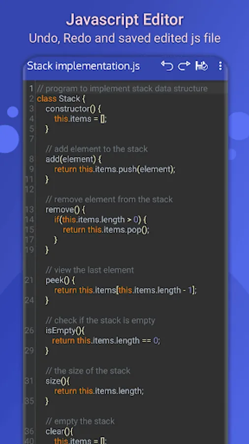 Explore the world of programming with JavaScript Viewer. The app is packed with all the features you need to explore code, from text editors to syntax highlighting, undo, redo, auto code completion, auto indentation and many more. Javascript editor font size can easily be changed from setting.