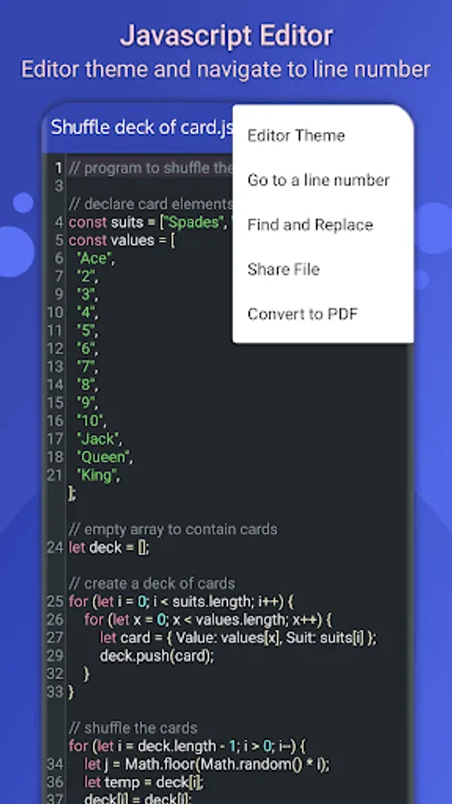 If you are worrying about javascript file that how to read and edit JS file, then you are at the right place. Javascript viewer is used to view and edit any javascript file easily without any code loss. In Javascript editor you can easily save all edited file and then view it within the app easily. Javascript editor also allow you to convert javascript into pdf file.