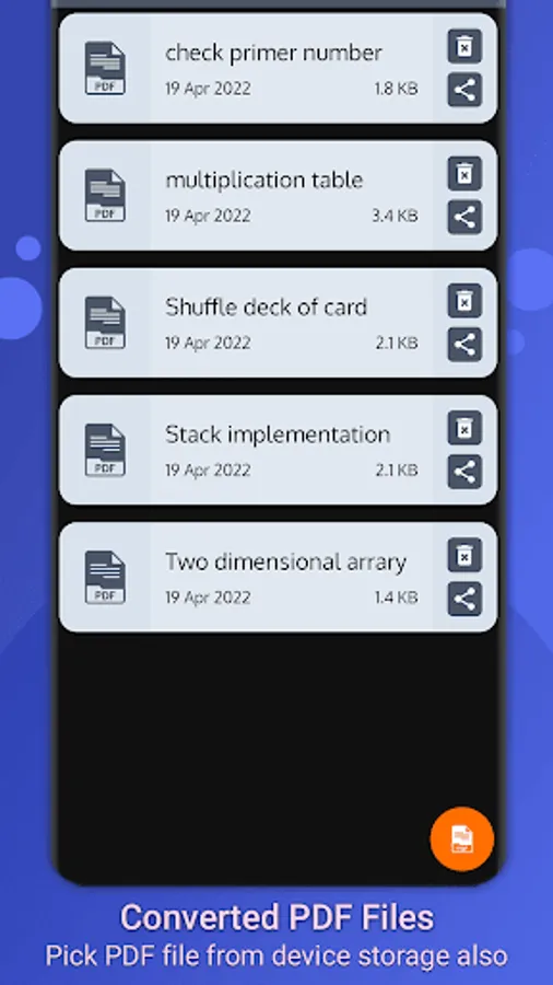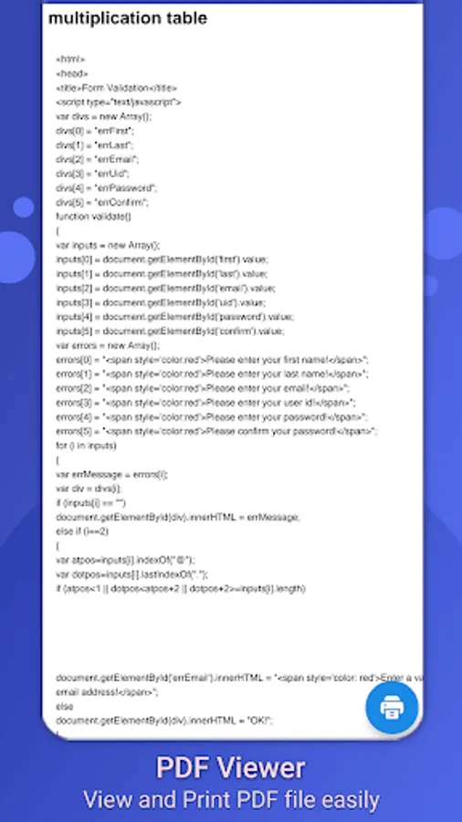 In Javascript file reader you can also view all converted javascript to pdf files, which are easy to share and delete. All those converted pdf files can be viewed through built-in PDF viewer and also print the pdf file directly.