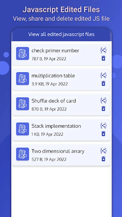 You can easily save all your edited JS file and view all those edited files within the app for easy navigation. The edited JS file will be removed when user uninstall the app, so before uninstalling the app move your JS files into a safe place.