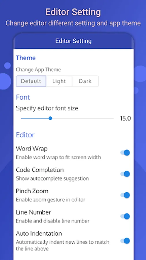 Javascript editor has different themes which will beautify the code more with different syntax highlighting. There are 3 different themes of javascript file reader app I.e. Default, Light and Dark.