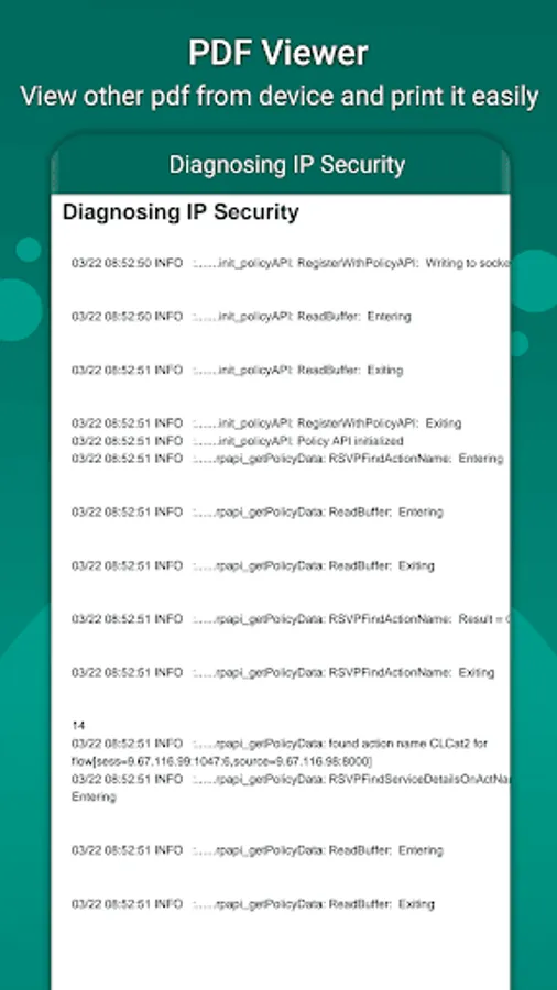 Log Reader is an app to read, save, and convert log to pdf. It includes features such as: being able to pick a pdf file from device to view it and print it. It also includes a "pdf converter" feature which changes a log file into a pdf file without any text loss.
