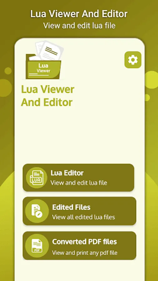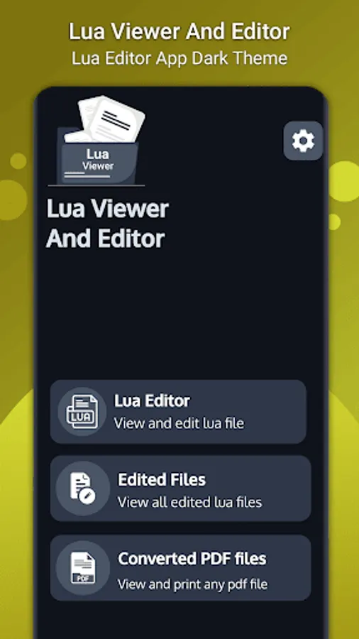 Lua file opener has the ability to open and edit lua files. With its light and dark app themes, it will suit your needs even if you work in a dark room. You can customize settings to suit your needs and make Lua Viewer as personal as you want it to be!