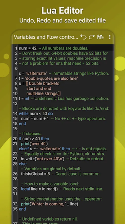 Lua editor is very useful tool for viewing and editing lua files, if the app is helpful to you then support us by your positive feedback.