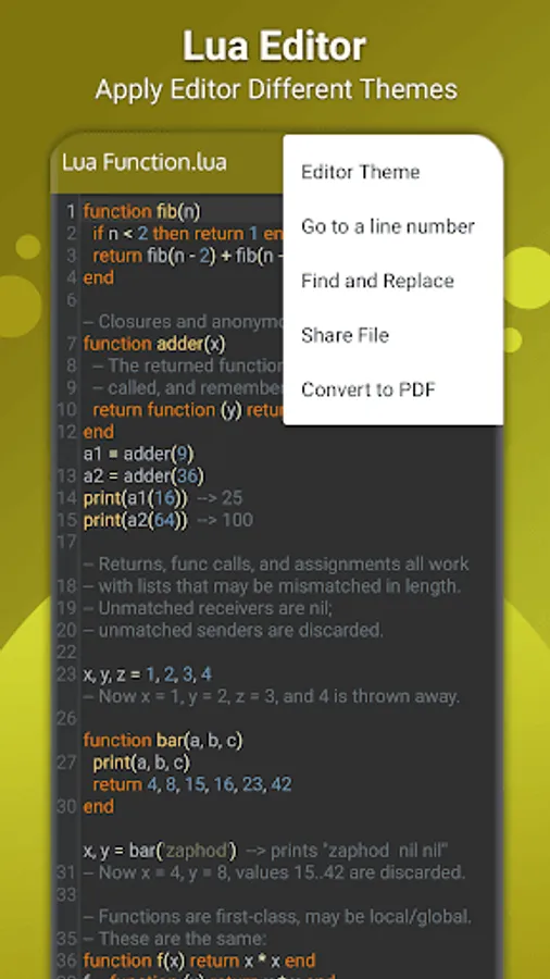 Lua is a lightweight scripting language. Lua Viewer is a lua file reader which supports different features like pinch to zoom, auto code completion, auto indentation and enable/disable editor line number.
