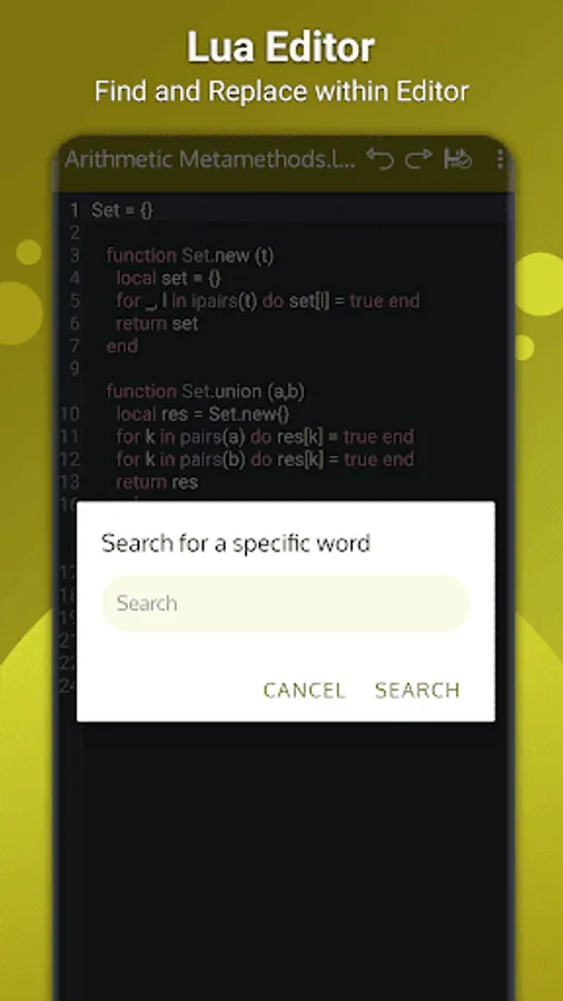 As a lua developer, you need a lua file opener that can read and edit any file you want. This is the solution for you. With an undo and redo option, it helps you go back and forth in your programming process. . Lua file reader also support find and replace operation with which you can easily find any word and replace it with another word. With lua editor you can easily go to any line number within editor, change editor text size etc.