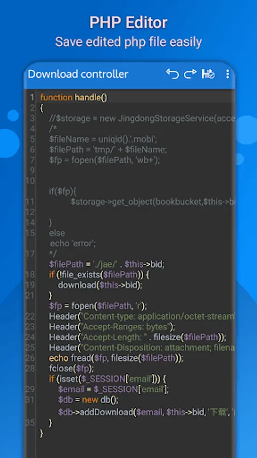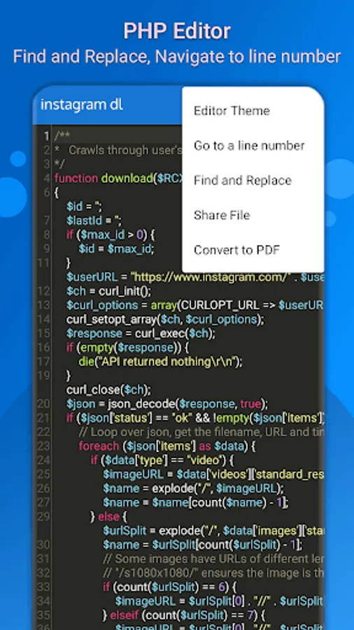 PHP editor has very useful feature like undo, redo, find and replace etc which help user while editing code. Php file opener or file reader has different editor themes which will beautify the code with different syntax highlighting and help user to view the code easily. The font size of editor can easily be change from app setting.
