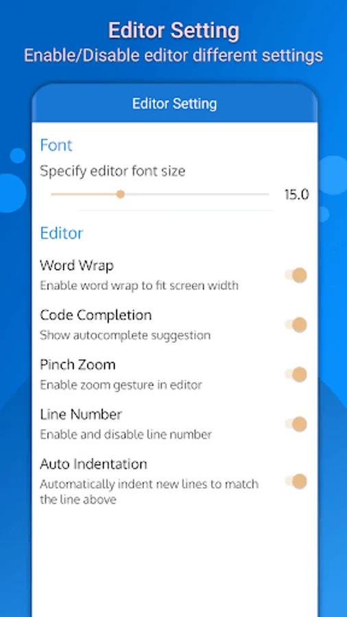 The editor of php viewer has different editor setting which can be enable and disable from app setting easily like Auto code completion, editor line number, editor font size, word wrapping and many more.