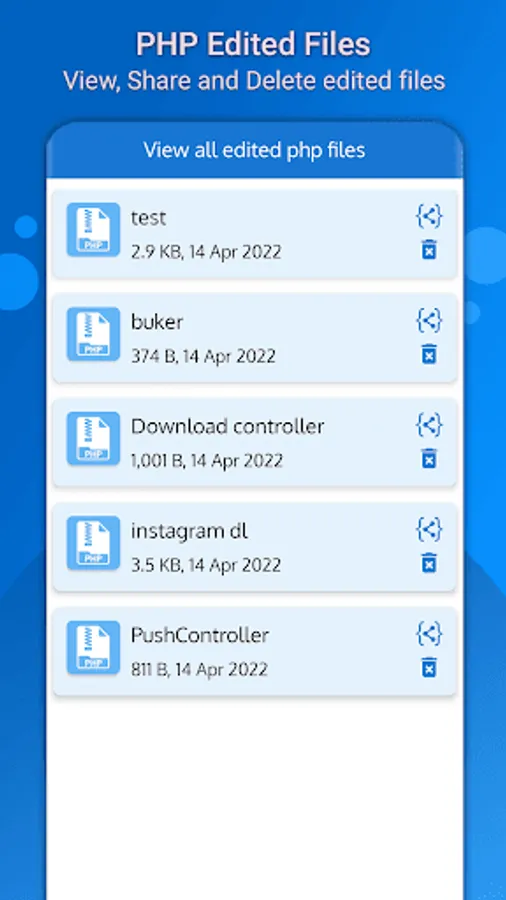 All edited file of php file opener are saved within device storage and are removed when user uninstall the app. You can easily view, share and delete edited files within the app easily.