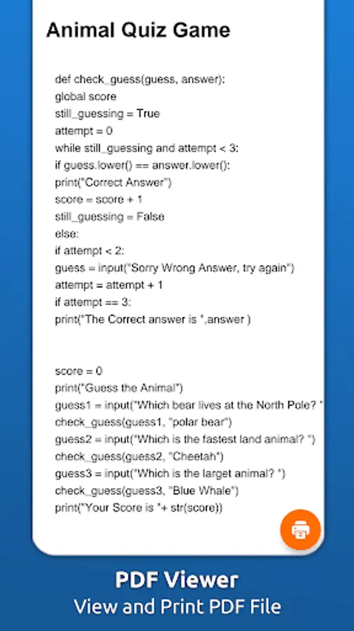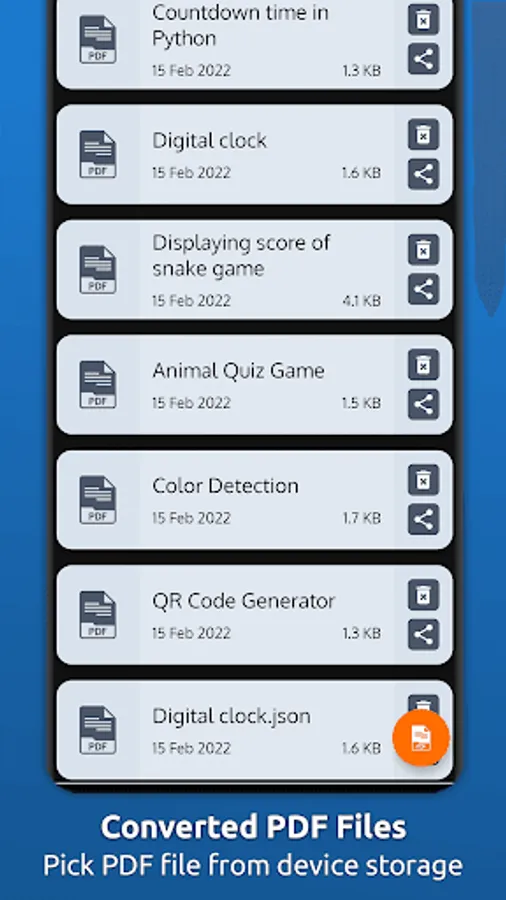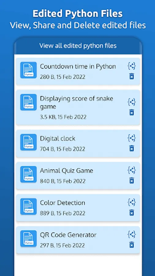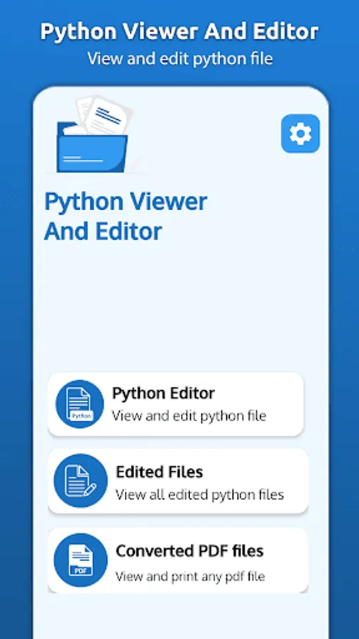 Through python reader learn python code easily. Python file viewer will list all edited python file which you can easily open in editor for further use. Python file opener also list all converted python to PDF files which you can share, delete and view it in a PDF viewer.