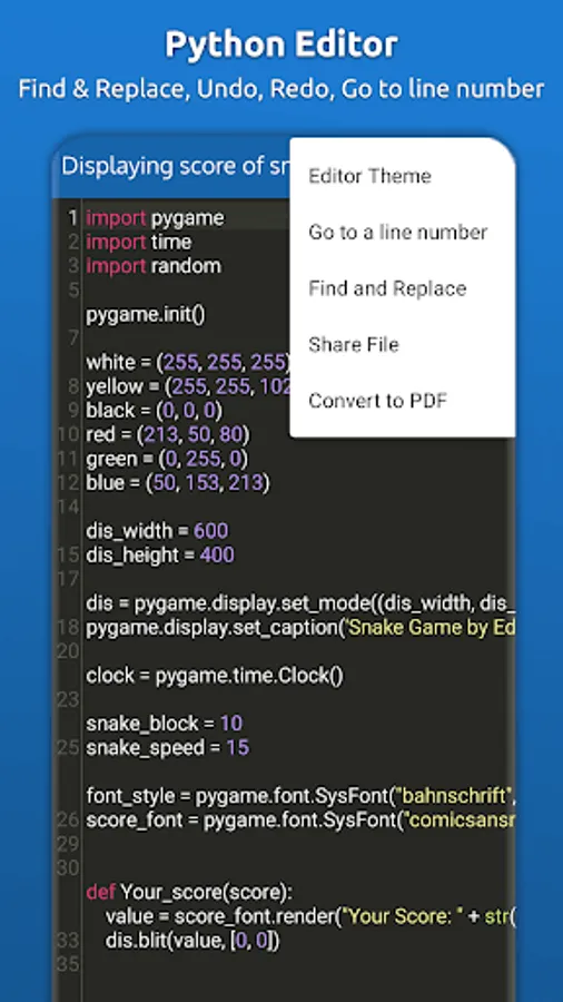 Python file viewer is a free tool that is used to view python code easily. Python viewer is also used as a python editor to edit python file easily and save it. Python file opener app is also used to convert python code into PDF file.
