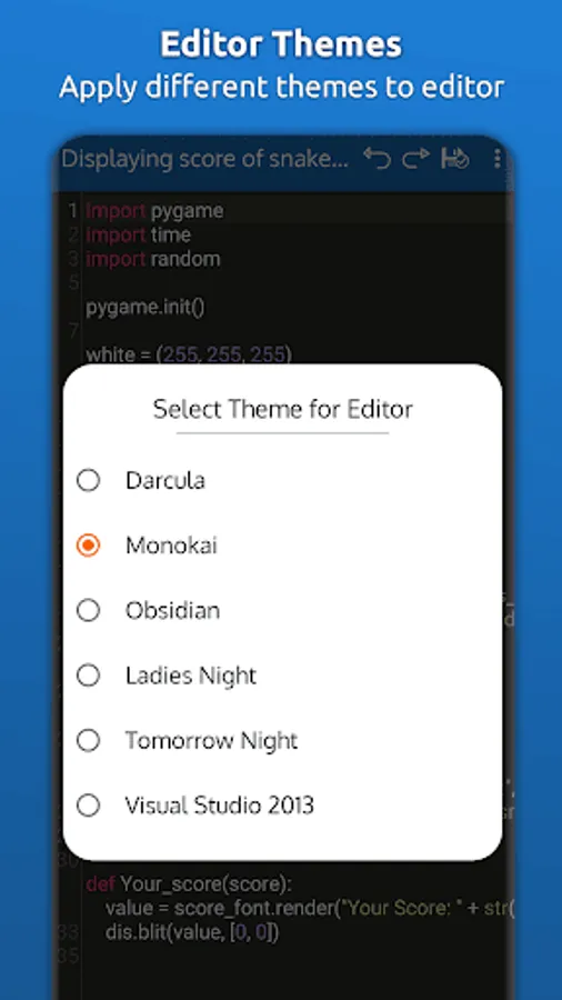 Python Viewer has a very power python editor which support syntax highlighting, auto indentation and having different editor themes. You can very easily change python editor setting by enabling and disabling different option of editor. Python editor also support undo and redo through which you can revert the code easily.