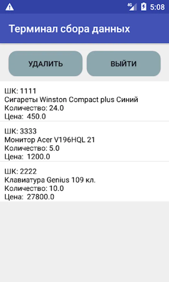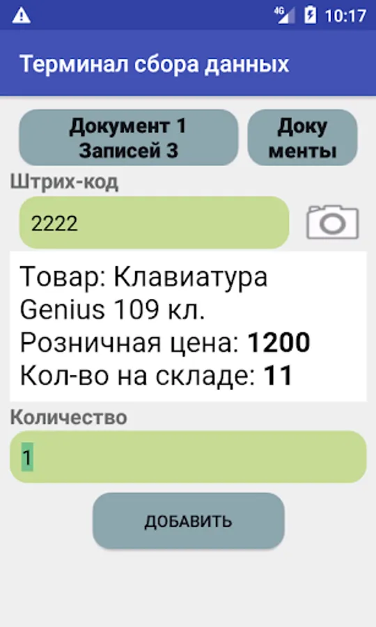 Three products with barcodes: 1111, 2222, 3333 are already included in the TSD. And also one document was compiled for unloading in 1s. To test how the loading of documents in 1C works, add three items with bar codes 1111, 2222, 3333 and make a download from any document that has a TSD icon.