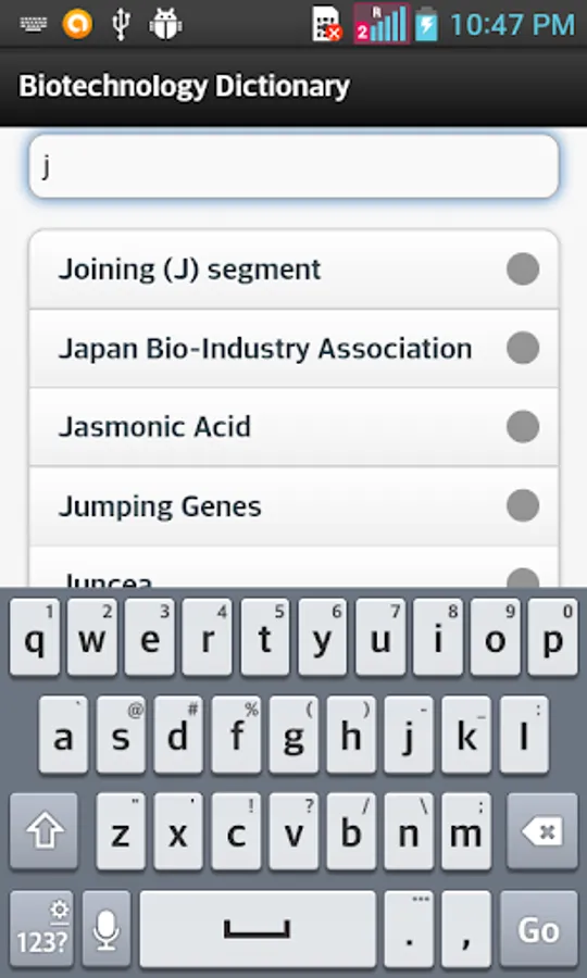 Dictionary contain words related to technological application that uses biological systems, living organisms with their meaning and short description of each and every word.Search option is also available to find out the word relayed to biotechnology.