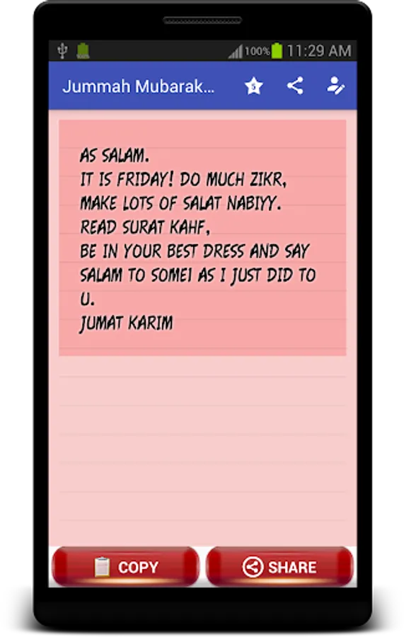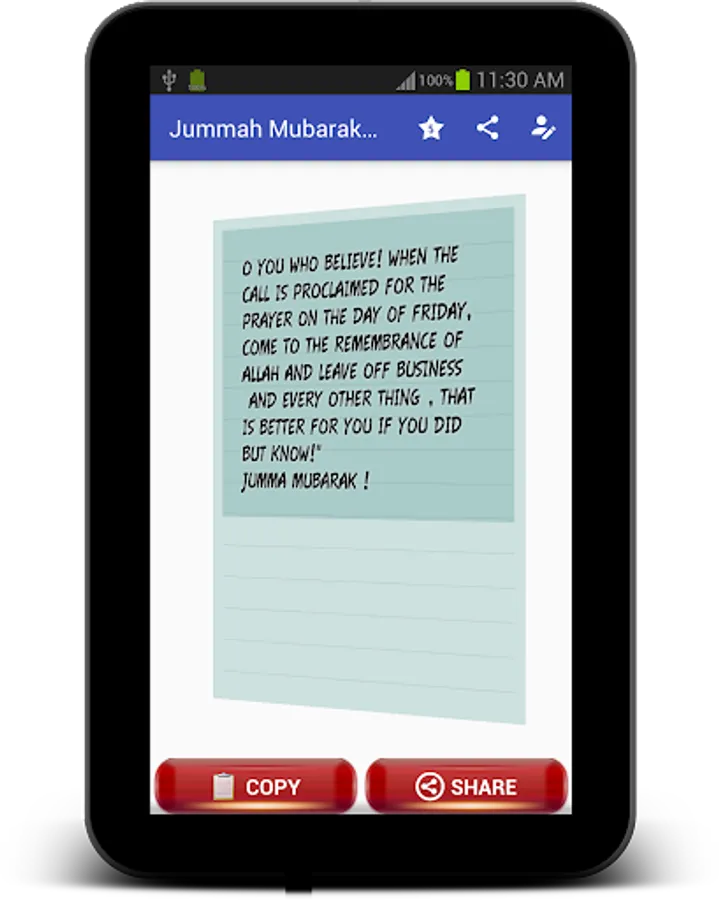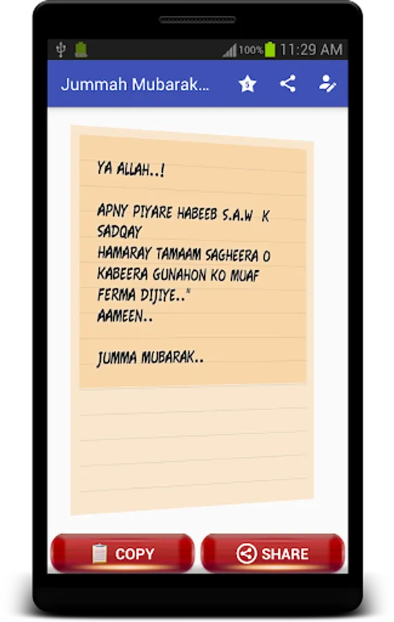 Considered to be most significant and Holy day for Muslims, Jumma brings blessings and mercy of Allah Almighty. Sending regards and Jumma Mubarak wishes to fellow Muslims is also practiced in Islam. Collection of "Friday Wishes ~ Jummah Mubarak" texts to wish your family and friends a "Blessed Friday" (Jummah Mubarak) via sms or sharing on any social network. You can copy your favourite text message to clipboard or share directly to facebook, whatsapp status or any other messaging app in your mobile. Send special duas and Jumma Mubarak SMS to their family and friends at the beginning of the Friday. Find large collection of Jumma Mubarak SMS messages / blessed friday wishes in this app. Express your gratitude and feelings by choosing a suitable message from latest Jumma Mubarak, Jumma Mubarak SMS Quotes, Wishes, Greetings in Urdu, and English & Roman Urdu, Ramazan SMS collection, Ramadan Jummah Blessings to send them to your friend & family members in Pakistan / India and Worldwide now.