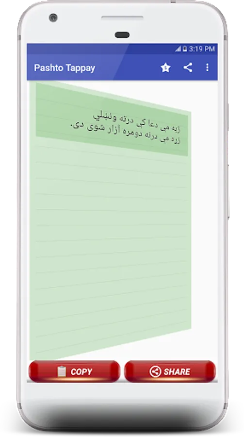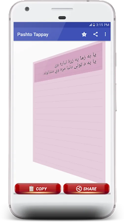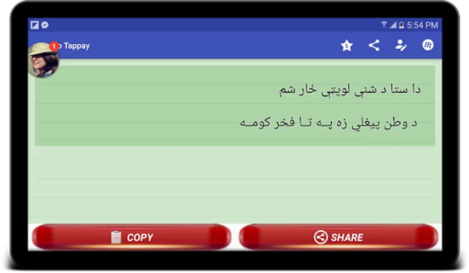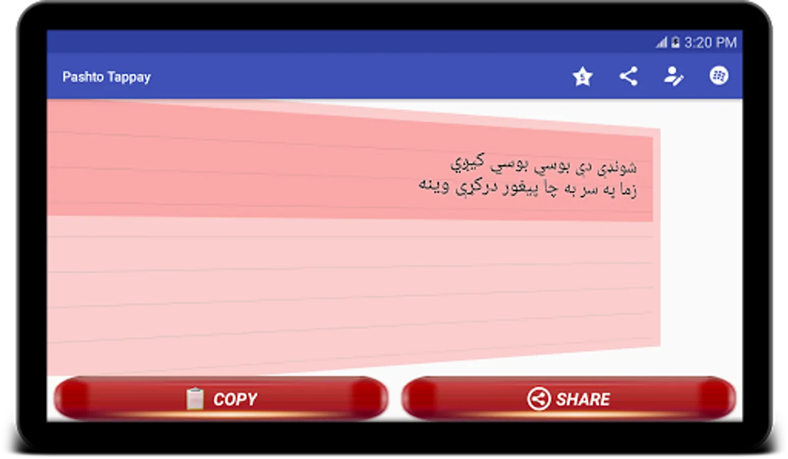 This app contains Pashto Tappay / Pshto Text Messages and shayri afghan pashto poetry tapy. this is one of bigger and better collection of sms or mobile / text messages in pakhto languages of Khyber Pakhtoon Khwa KPK and afghan etc. This app contains huge collection of pashto sher. Spread pakhto tappay messages in your family and friends on facebook, whatsapp, or SMS.