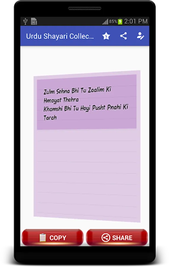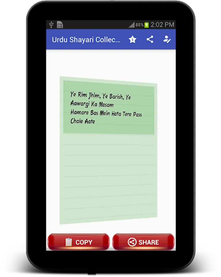 This app contains urdu shayri texts which can be shared easily with friends via sms and / or whatsapp / fb messages. This collection is regularly updated. Enjoy shayri (poetry) of urdu and share your favorite with friends and loved ones.