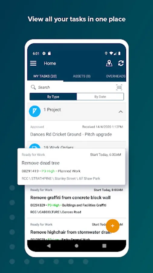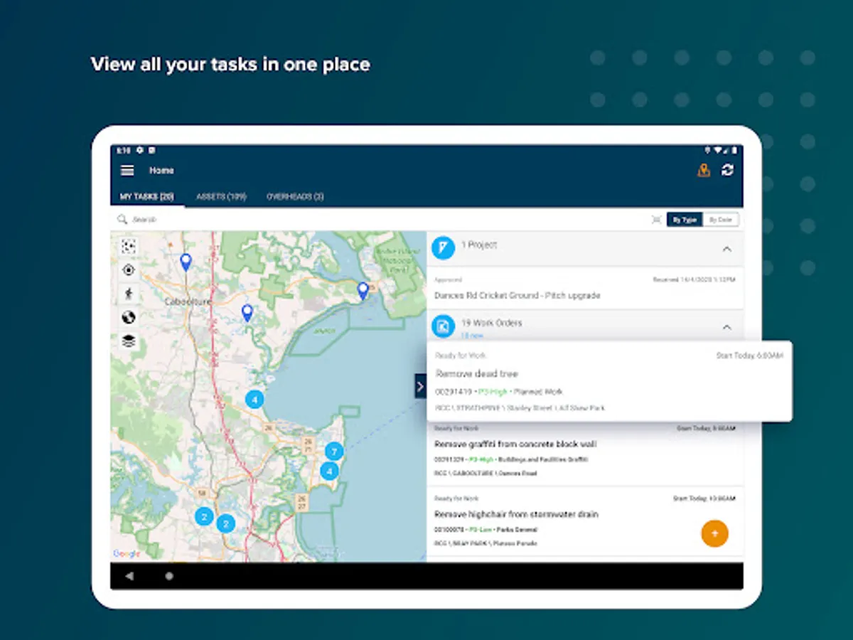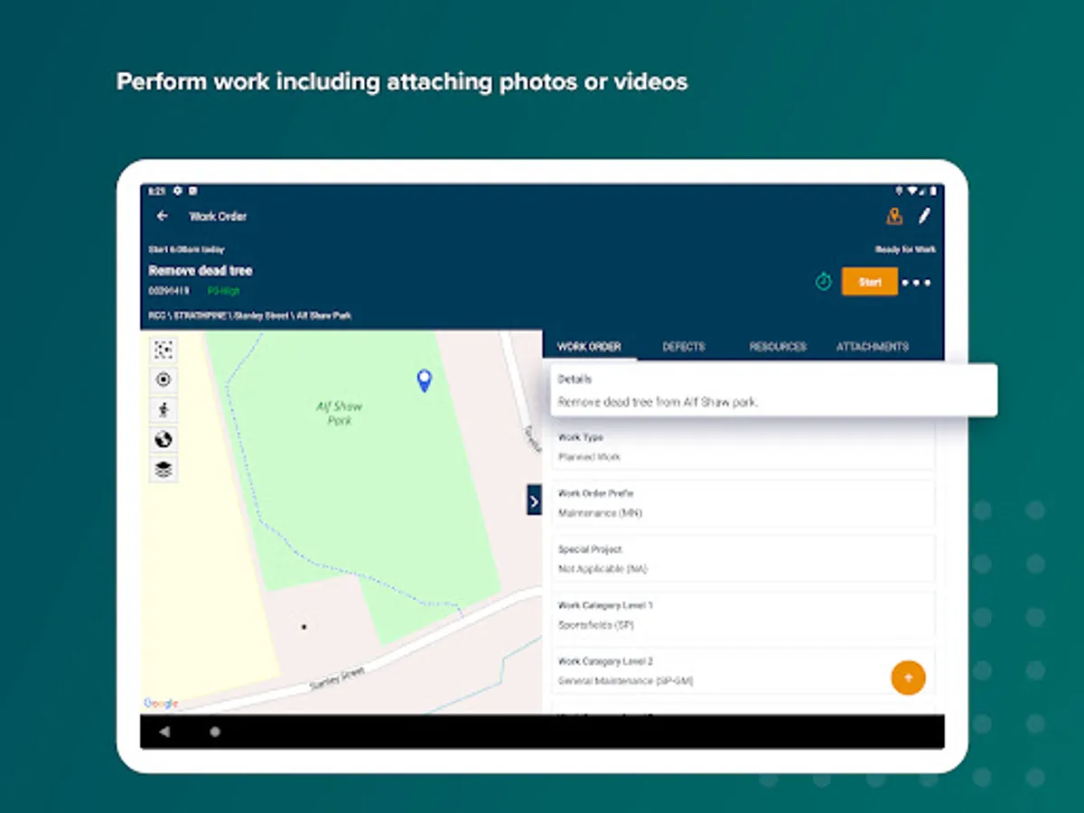 Field Work Execution displays work orders information including attachments, related assets, defects, inspections and map locations. You can manage asset defects, perform scheduled asset inspections and record labour and plant usage. Also attach photos and videos, enter completion comments and choose a decision for the work order as part of performing your work.